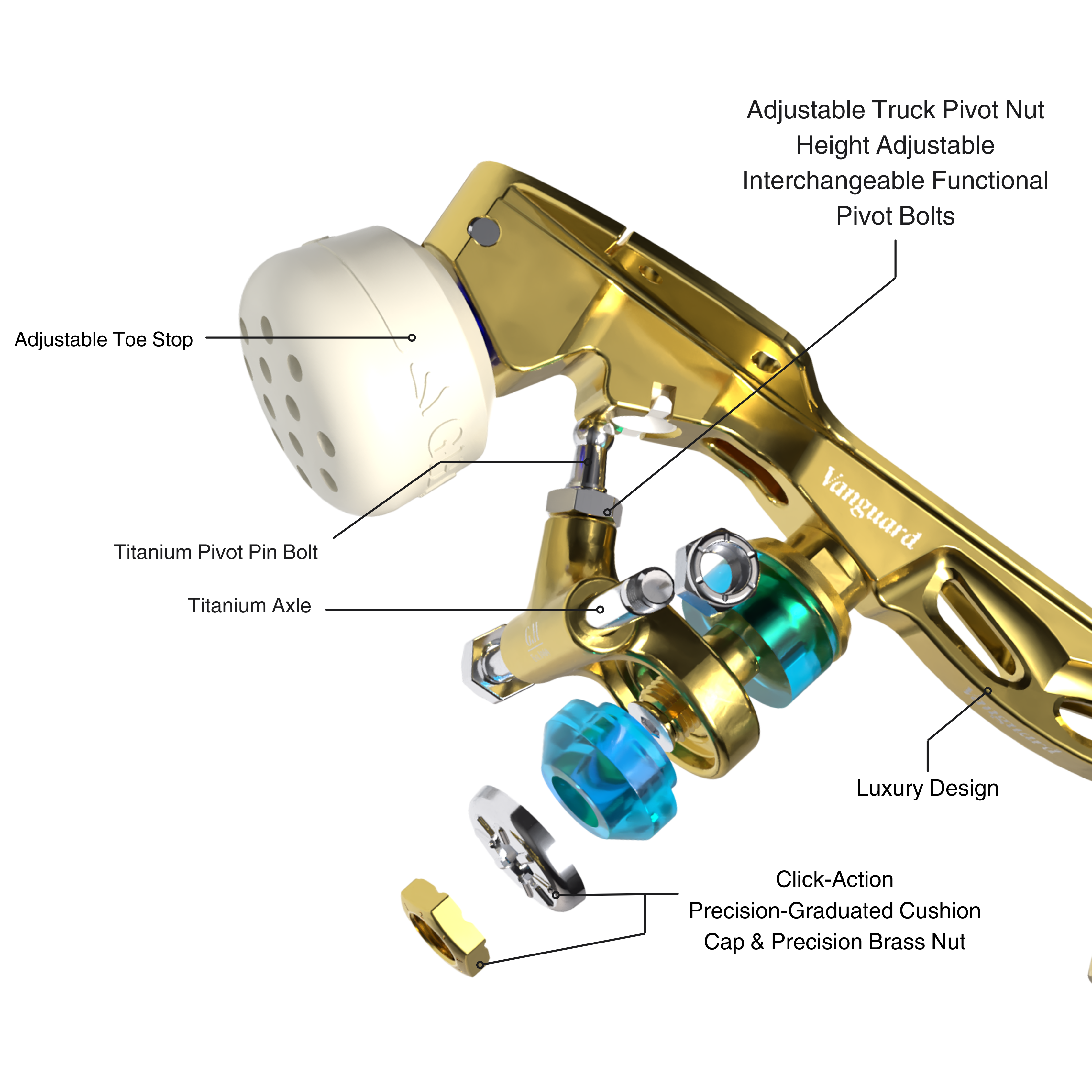 GH Skates’metal plates are not just visually striking with their signature gold finish; they are also packed with cutting-edge technology, protected by a world-patented multifunction metal plate design. One of the key innovations is the trim lowered by 5mm., which significantly improves stability when landing jumps and enhances edge control. The “Click-action” mechanism ensures precise truck adjustments while maintaining orientation even during complex movements. Additionally, the plate is crafted from a drawn Ergal bar and is fully CNC-machined, ensuring superior accuracy and durability.