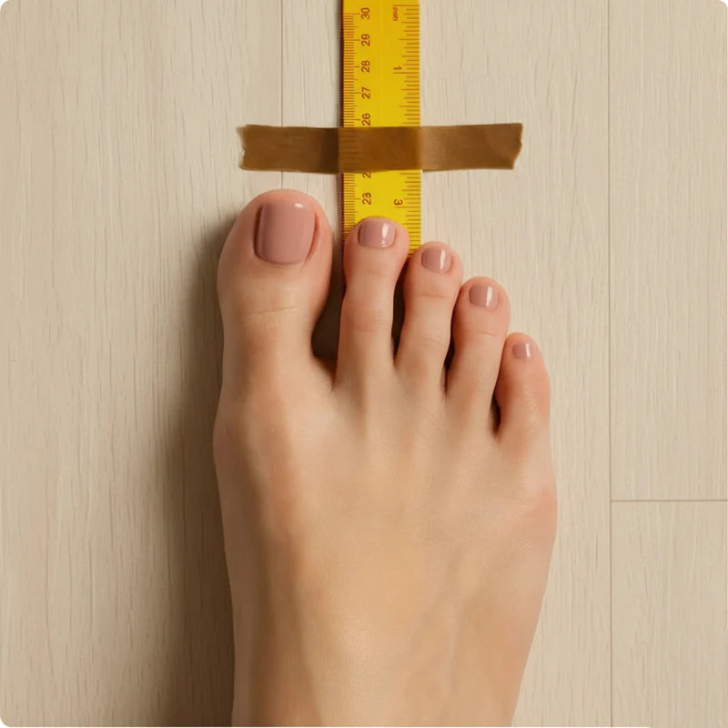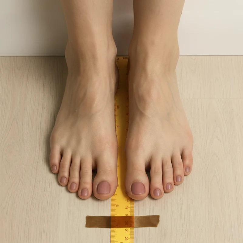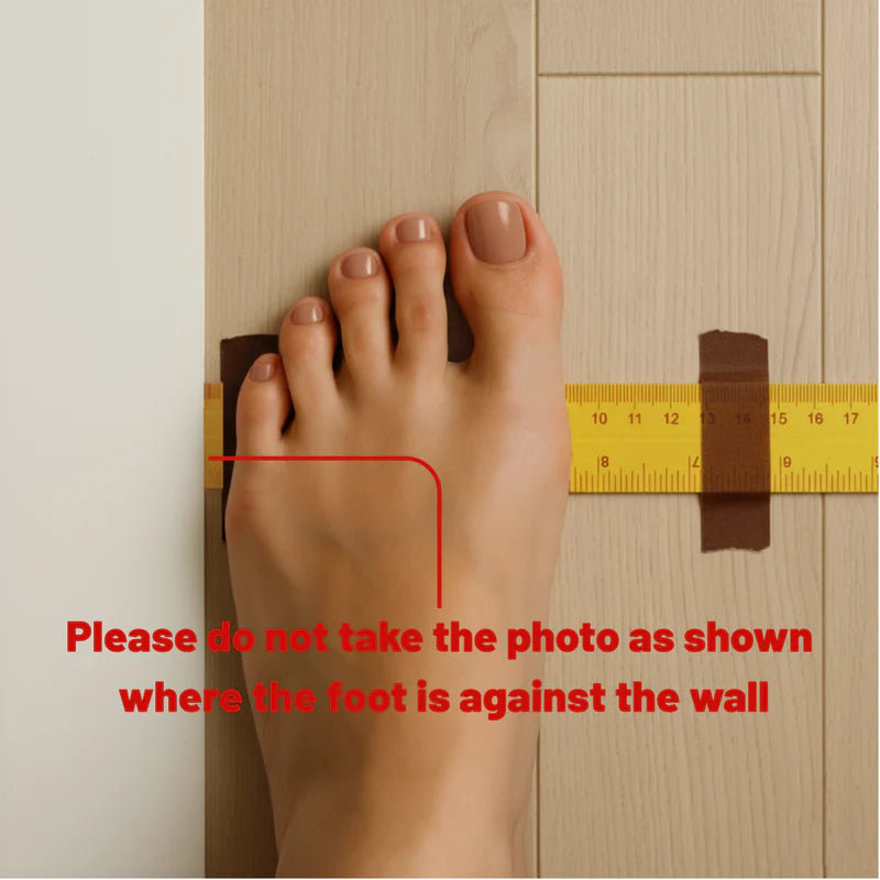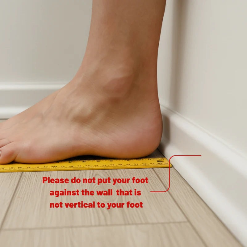 Please stand with both feet flat against the wall vertically so we can confirm the length is accurate for both feet. Make sure the ruler’s head and the two tapes on the ruler are clearly visible.