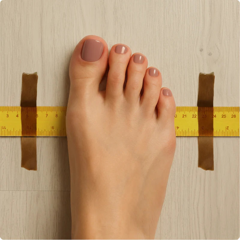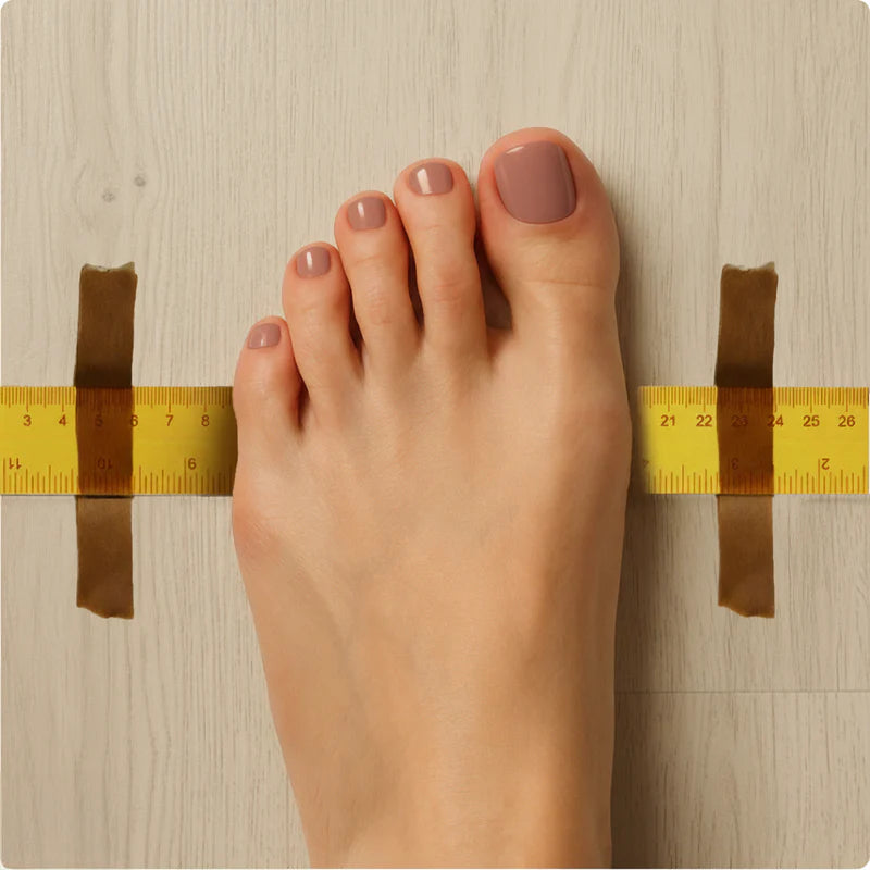 Step on the ruler using the widest part of your foot. Take the photo of your feet, width vertically downward—the width of your right foot.