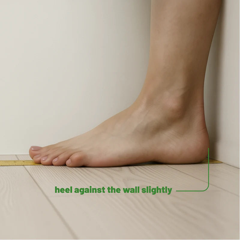Put your ruler against the wall first. Then, place your foot on the ruler with your heel touching the wall slightly.