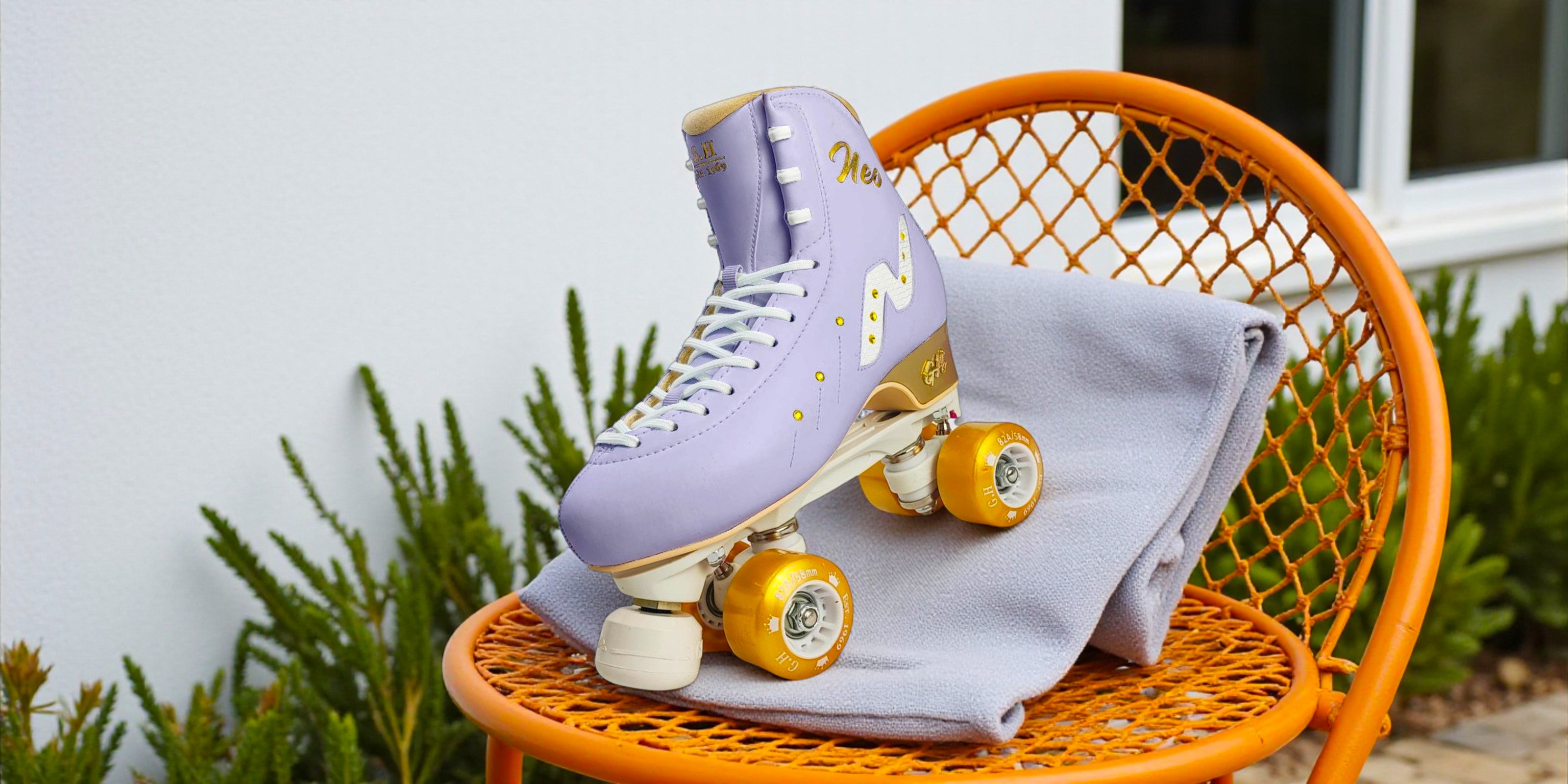 The Neo Quad Roller Skates from GH Skates stand out with Golden Star Crystals(Swarovski Light Topaz) that add a touch of luxury. The signature "N" design enhances the modern look, making these skates shine on and off the rink.