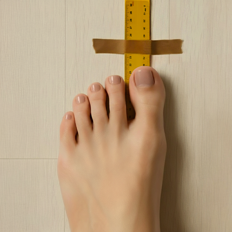 Please stand with both feet flat against the wall vertically so we can confirm the length is accurate for both feet. Make sure the ruler’s head and the two tapes on the ruler are clearly visible.