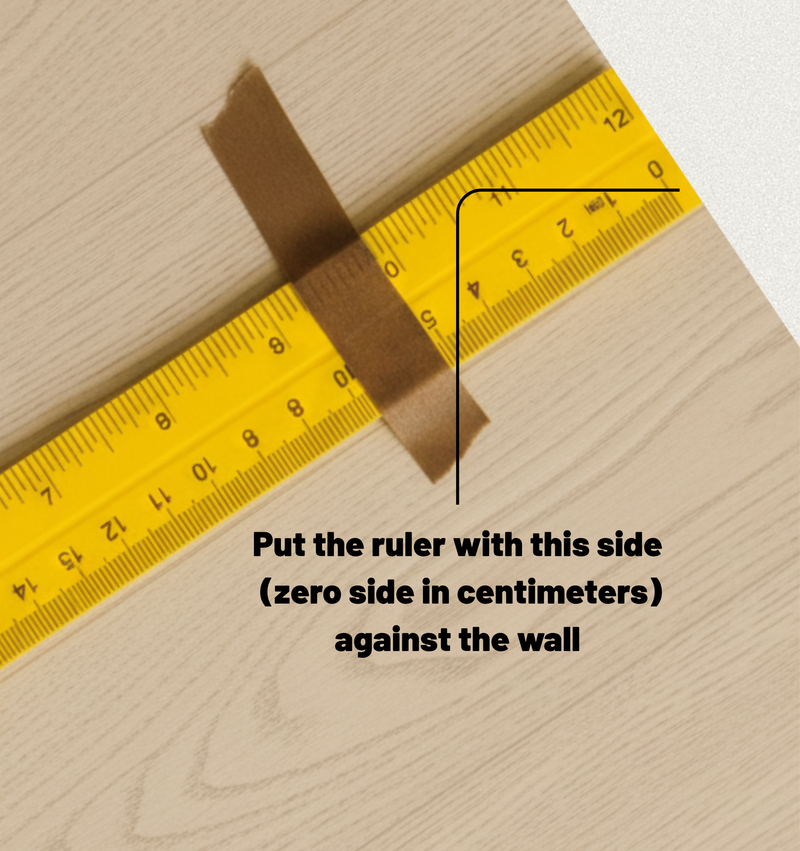 - Put the ruler with this side (zero sides in centimetres) against the wall.