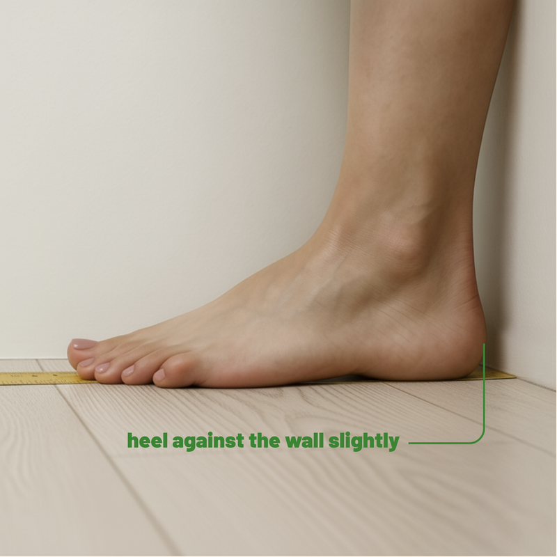 Put your ruler against the wall first. Then, place your foot on the ruler with your heel touching the wall slightly.