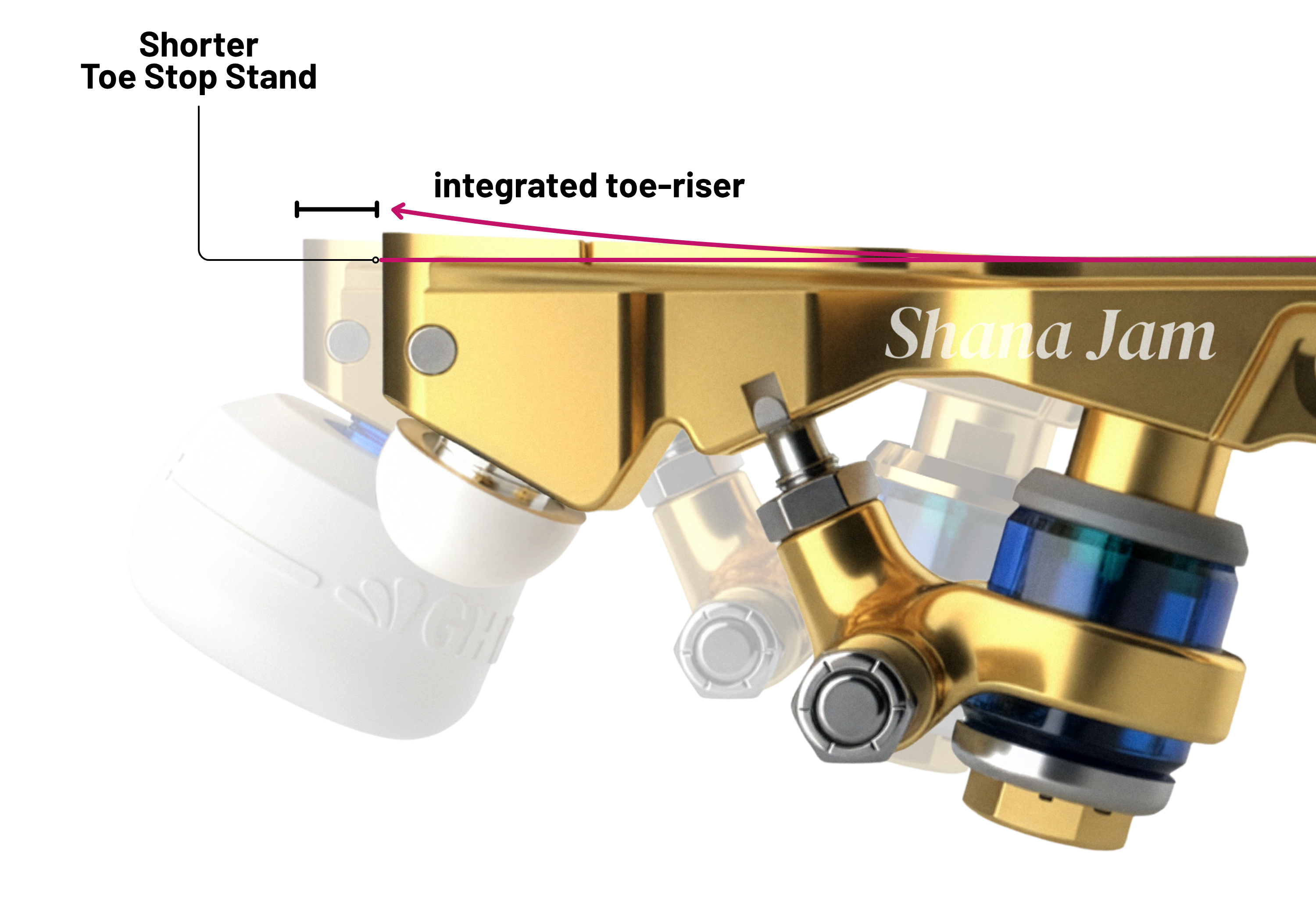 Say goodbye to restricted movement. The naturally integrated toe-riser eliminates the need for a Power Wedge, perfectly positioning the truck under the ball of your foot for maximum agility. The specialized dropped Toe Stop Stand creates critical front-end space for complex jam moves.