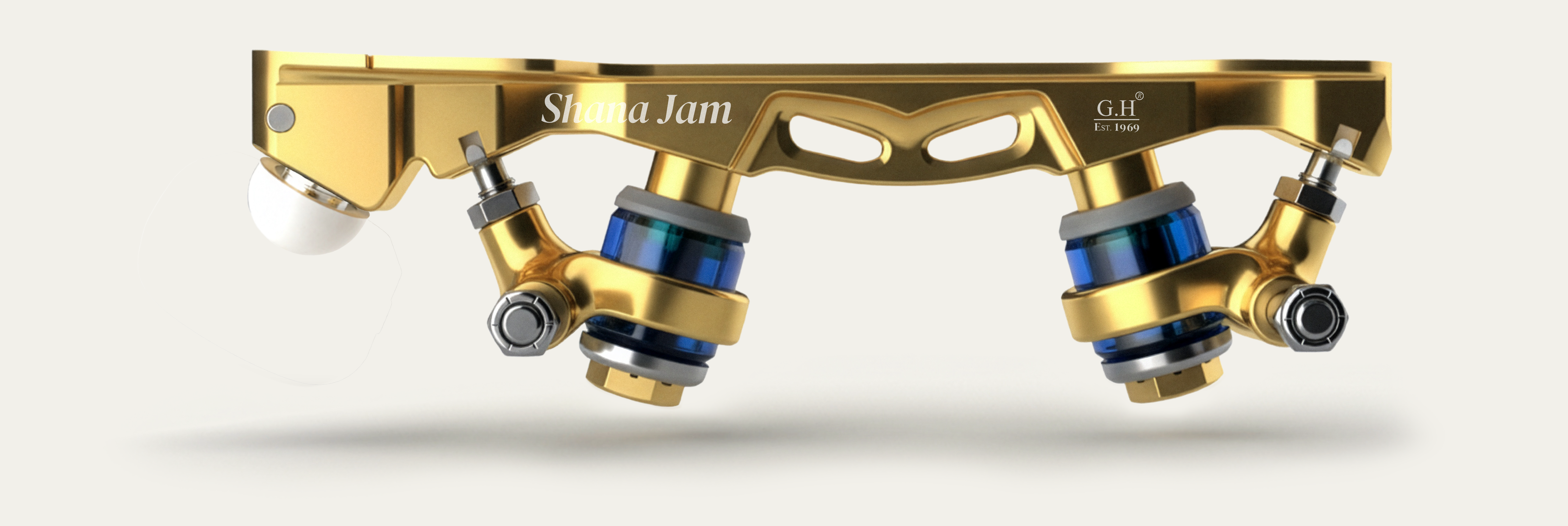 • Shana Jam Plates: crafted in-house by GH Skates using alloy aluminum with titanium truck axles and pins. The Shana plates feature a